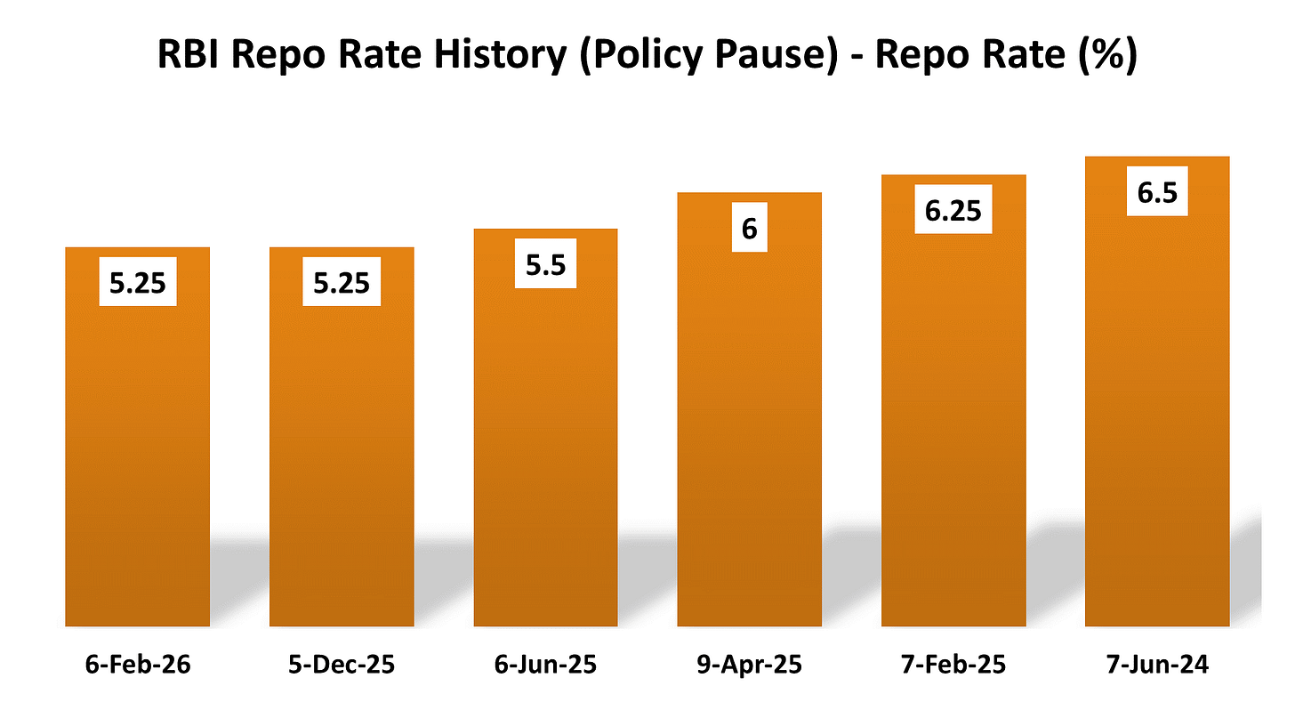 At its February 6, 2026 meeting, the RBI maintained the repo rate at 5.25% and retained a neutral stance.
