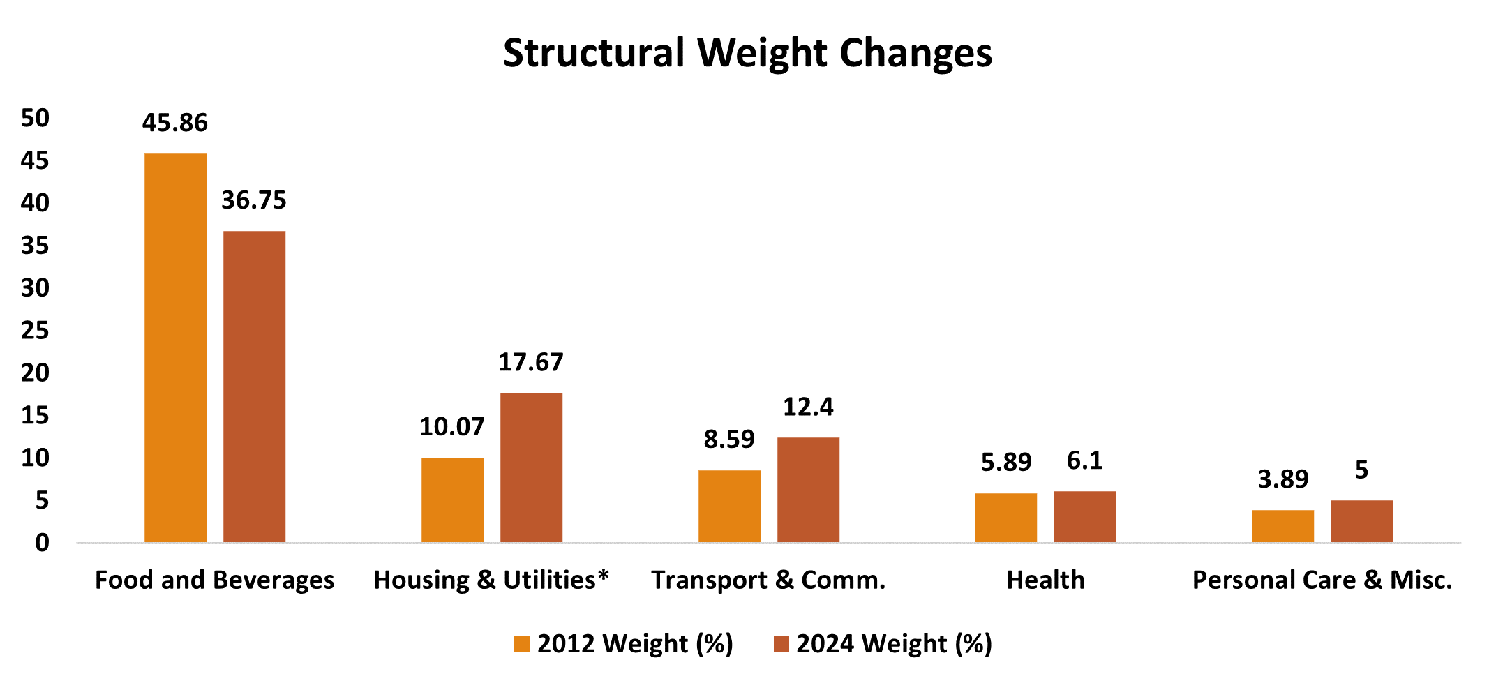 The most dramatic structural shift is in the weight of Food and Beverages: