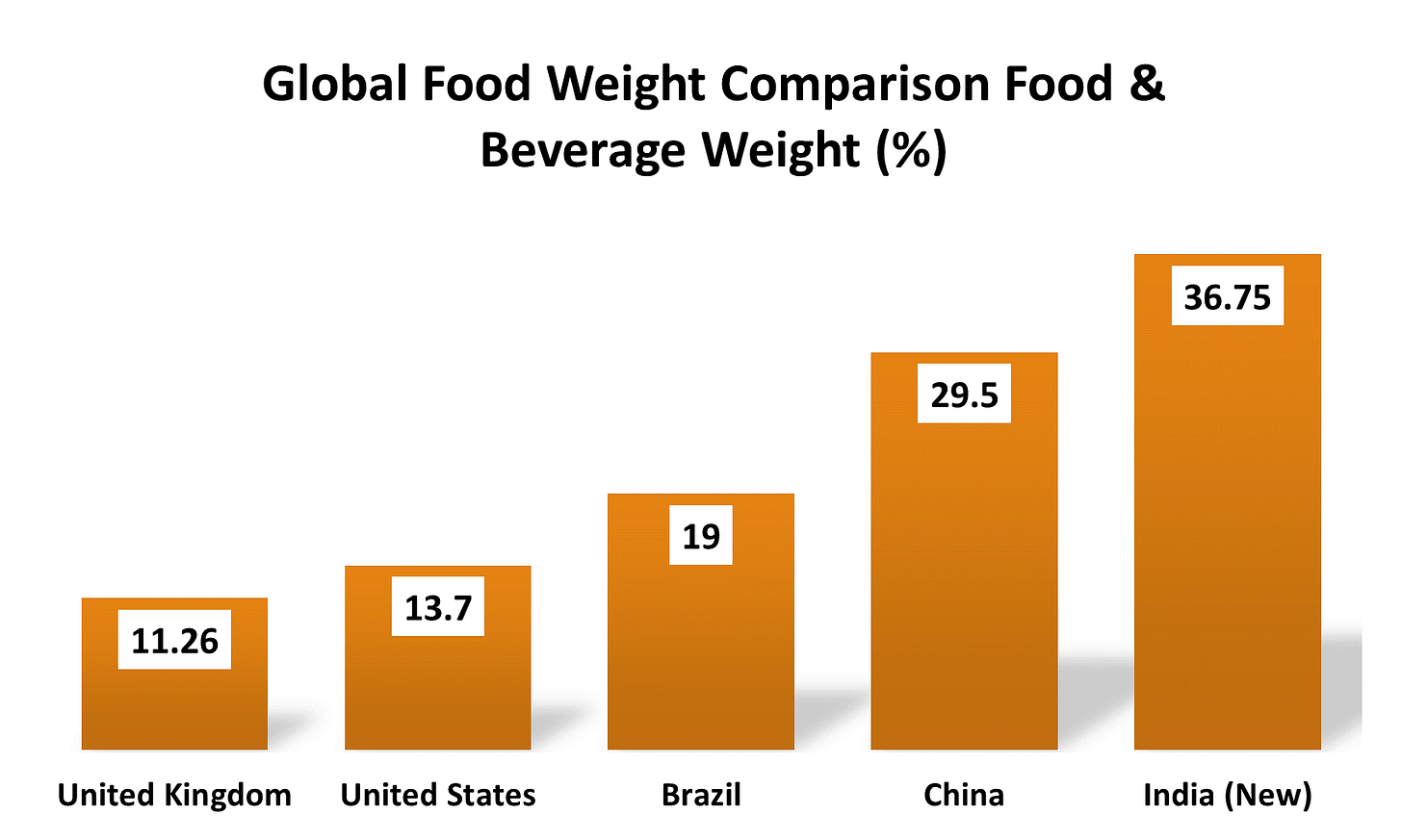 India’s new food weight of 36.75% places it in an interesting middle ground.