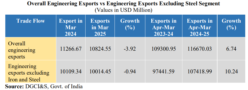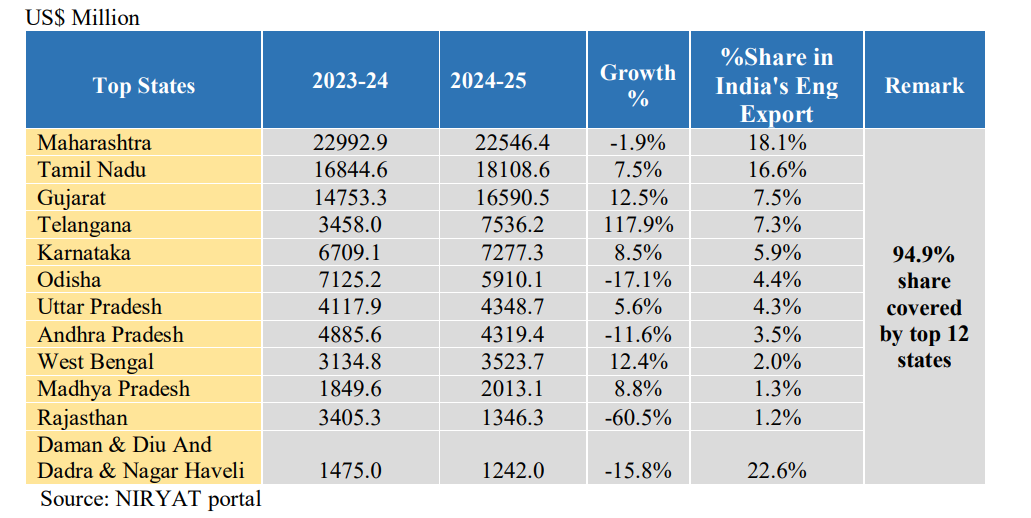 Engineering goods (including construction machinery, fabricated structures, and related products) reached a record USD 116.7 billion in FY25, up 6.74% YoY.