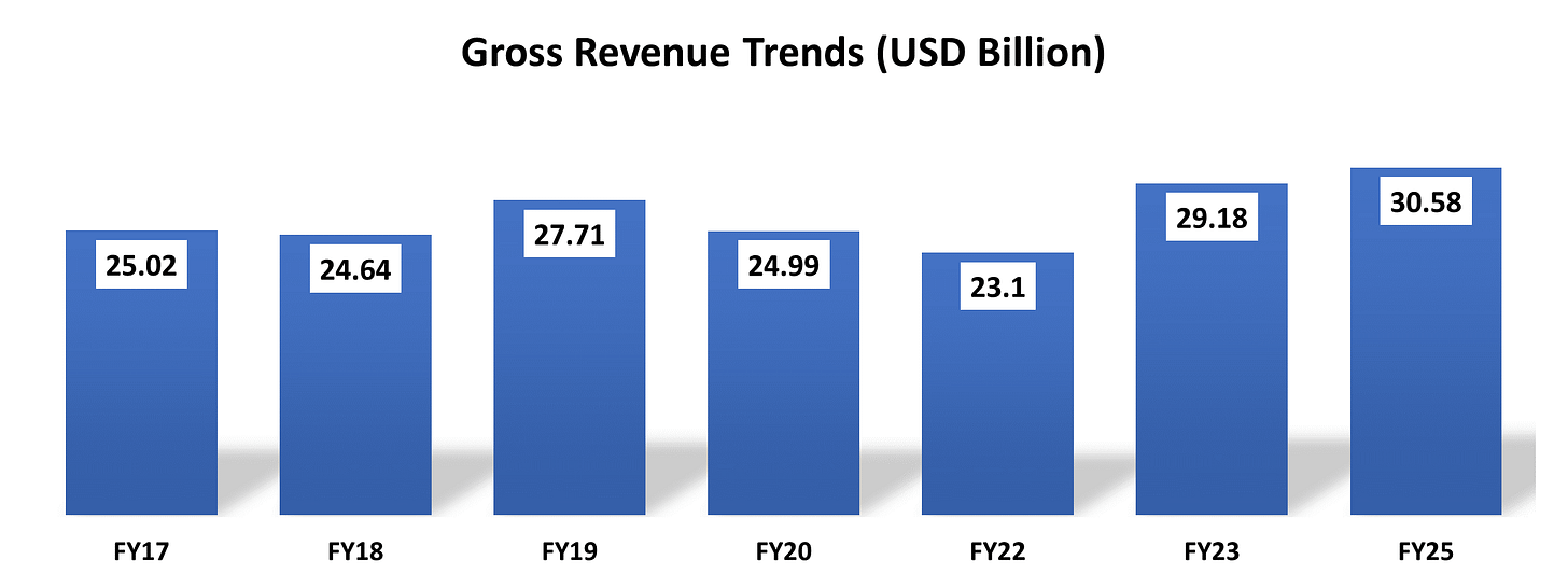 Gross revenue trends for the infrastructure sector specifically highlight a significant recovery from US$ 23.10 billion in FY22 to US$ 30.58 billion in FY25.
