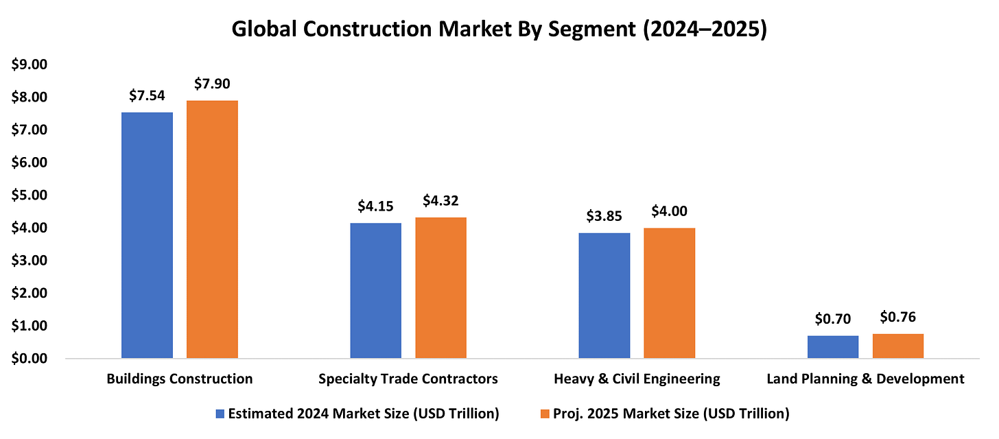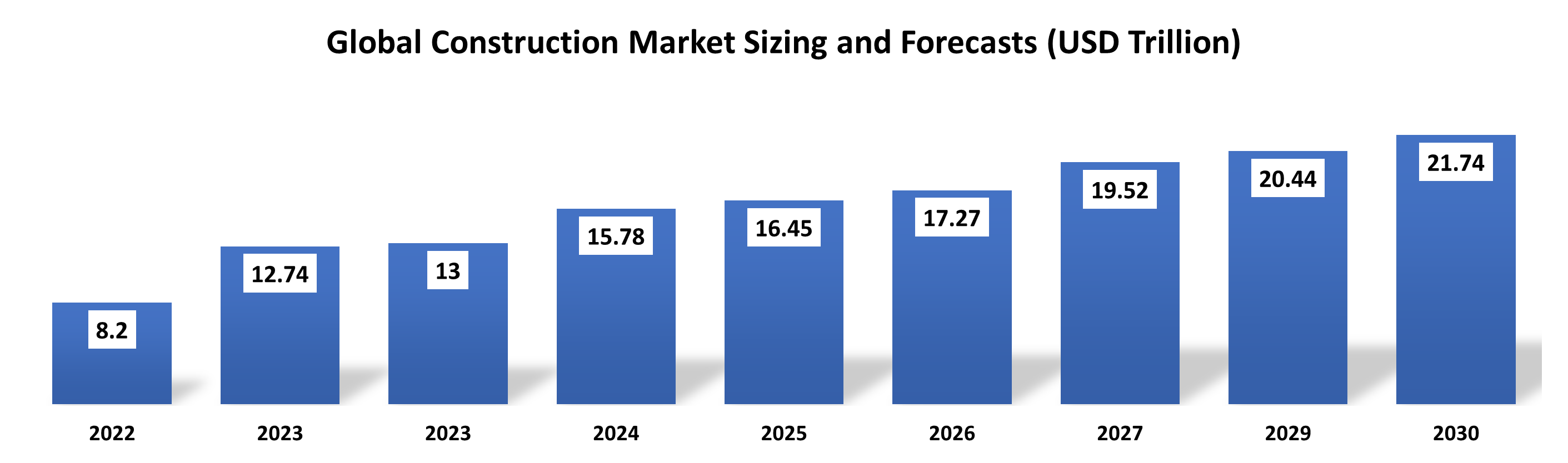 The global construction market is currently valued between 15.78 trillion USD and 16.04 trillion USD as of 2024. The sector is expected to expand to approximately 16.45 trillion USD in 2025, representing a compound annual growth rate (CAGR) of 4.3% in the near term.