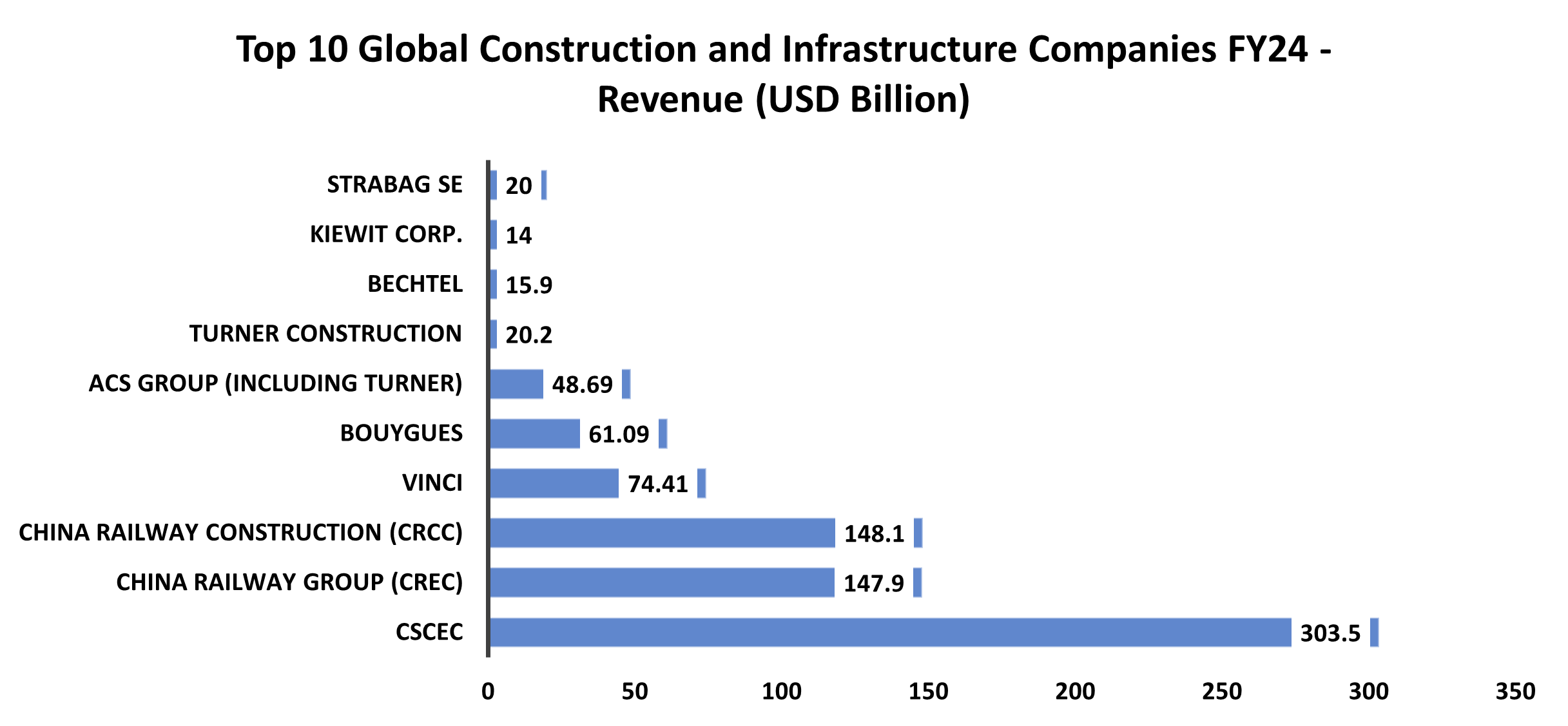 The competitive landscape is led by massive Chinese state-owned enterprises, with the China State Construction Engineering Corporation (CSCEC) remaining the world’s largest construction company, reporting a revenue of 303.50 billion USD in 2024.