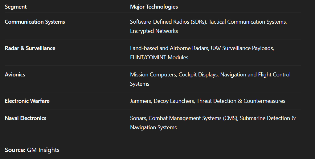 Airborne: Electronics installed on fighter aircraft, UAVs, AEW&C platforms, and military helicopters.