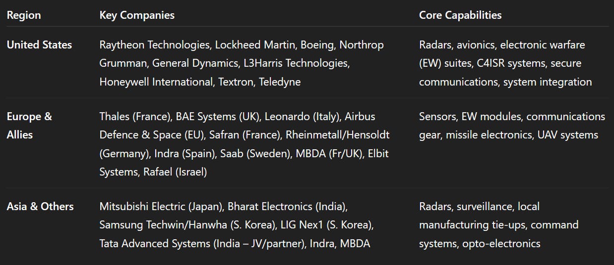 Europe & CIS: Key NATO countries (UK, France, Germany, Italy, etc.) maintain advanced defense electronics industries. Europe as a whole is a major but slower-growing market. For example, French firm Safran is expanding globally (announced its first overseas defense-electronics site in India in 2024). Israel (Elbit, Rafael) is a leader in EW and UAVs. Russia remains a significant market (especially for domestic firms) but faces export controls and sanctions. Other significant spenders include Turkey (Aselsan), Eastern European buyers (NATO upgrades), and a rising interest from Gulf states in sensors and networks.