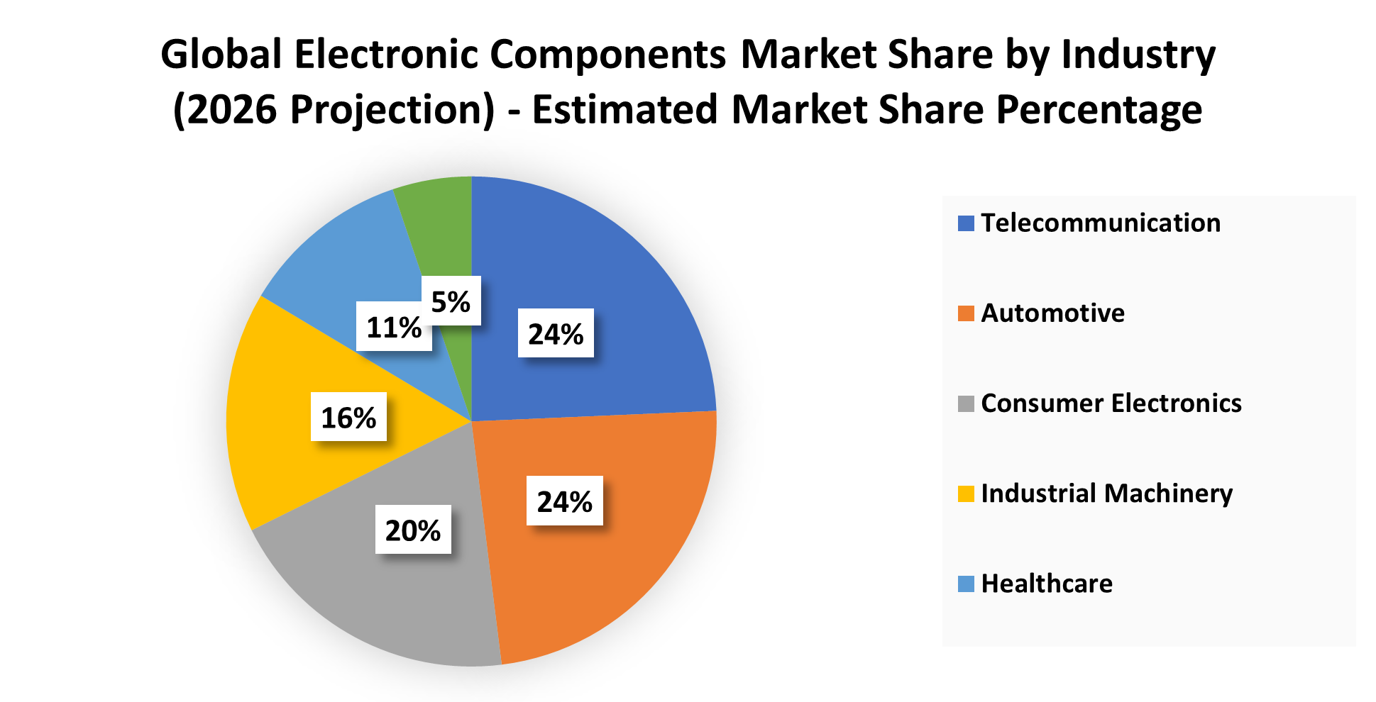 From an end-user perspective, the market is becoming increasingly diversified across high-growth verticals. According to 2026 projections, Telecommunications and Automotive are the primary value drivers, accounting for approximately 24.31% and 23.72% of the market share, respectively.