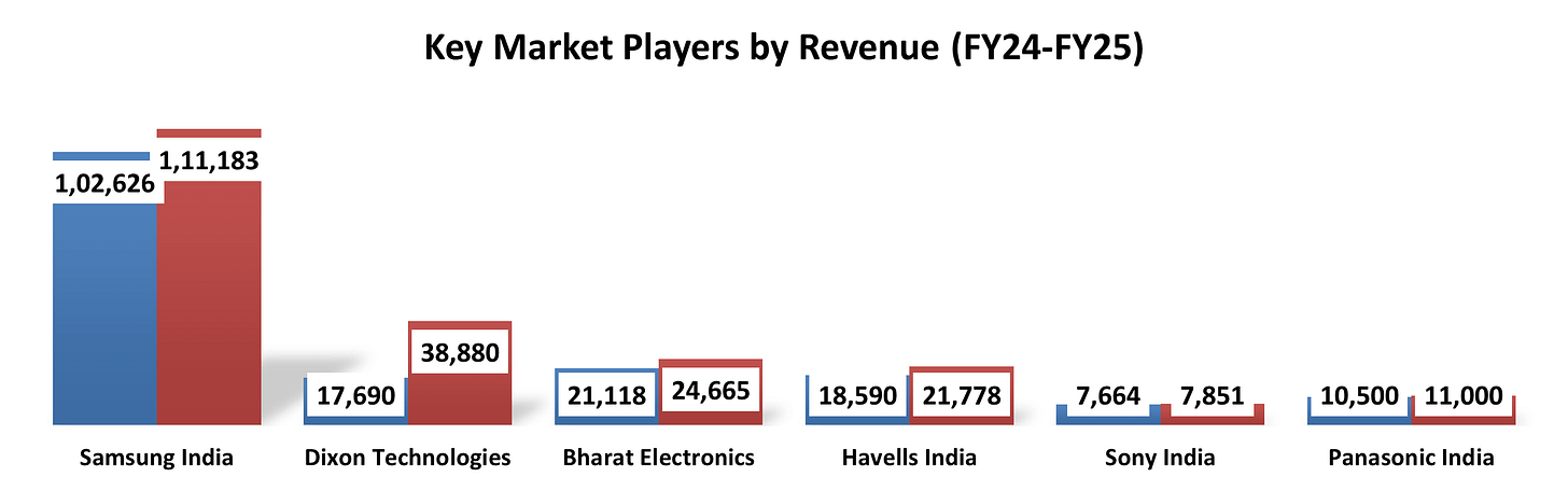 Leading players such as Samsung India Electronics Pvt. Ltd., Dixon Technologies (India) Ltd., Bharat Electronics Ltd., Havells India Ltd., Sony India Pvt. Ltd., and Panasonic India Pvt. Ltd. reflect a mix of global OEMs, domestic EMS providers, and strategic public sector enterprises shaping the ecosystem. Their increasing focus on localization, backward integration, and advanced manufacturing is expected to gradually strengthen India’s position in the global value chain.