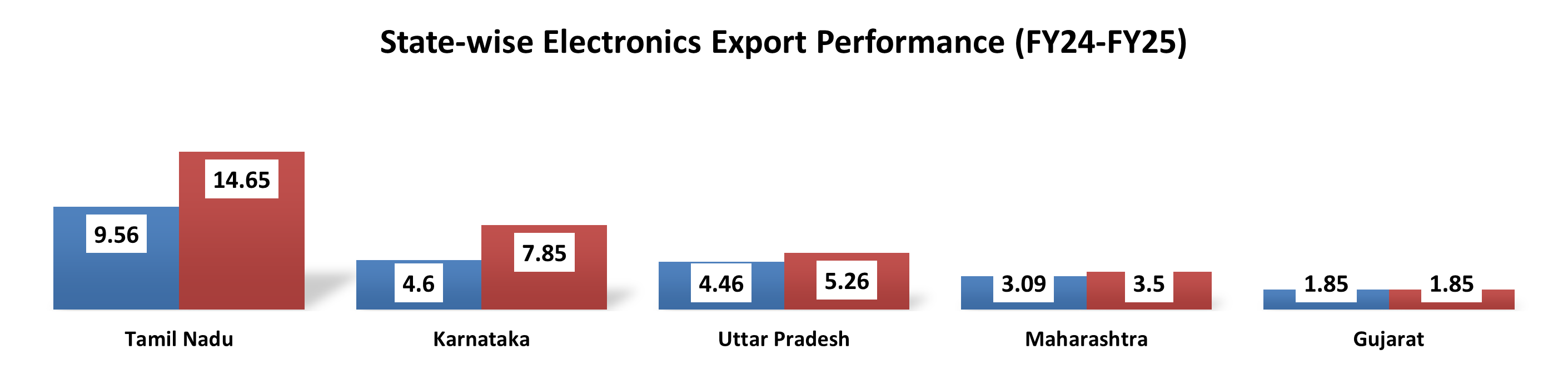 Karnataka follow as the second-highest contributor with a 22.09% share of national exports (US$ 7.85 billion), while Uttar Pradesh holds a 13.63% share, largely driven by the massive mobile manufacturing hub in the Noida-Greater Noida region.