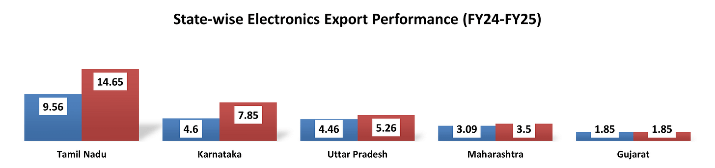 Electronics manufacturing in India is highly clustered in specific industrial zones, with Tamil Nadu emerging as the nation’s primary electronics capital. In FY25, Tamil Nadu accounted for a historic high of 41.23% of India’s total electronics exports, valued at US$ 14.65 billion .