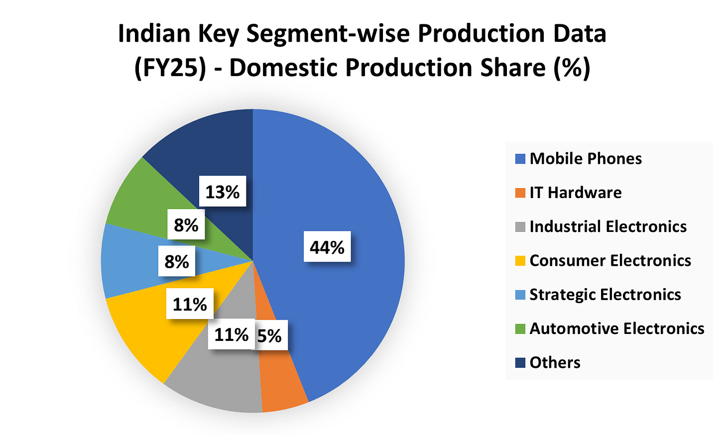 While consumer electronics and industrial electronics each represent about 11% to 13% of the production share, the government is aggressively pushing for expansion in IT hardware (laptops, servers, and tablets) through the PLI 2.0 scheme .