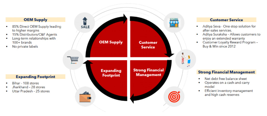 Aditya Vision Limited is a retail chain specializing in consumer electronics and home appliances, primarily operating in Bihar, Jharkhand, and Uttar Pradesh. It follows an omnichannel retail model, selling products through both offline stores and an online platform.